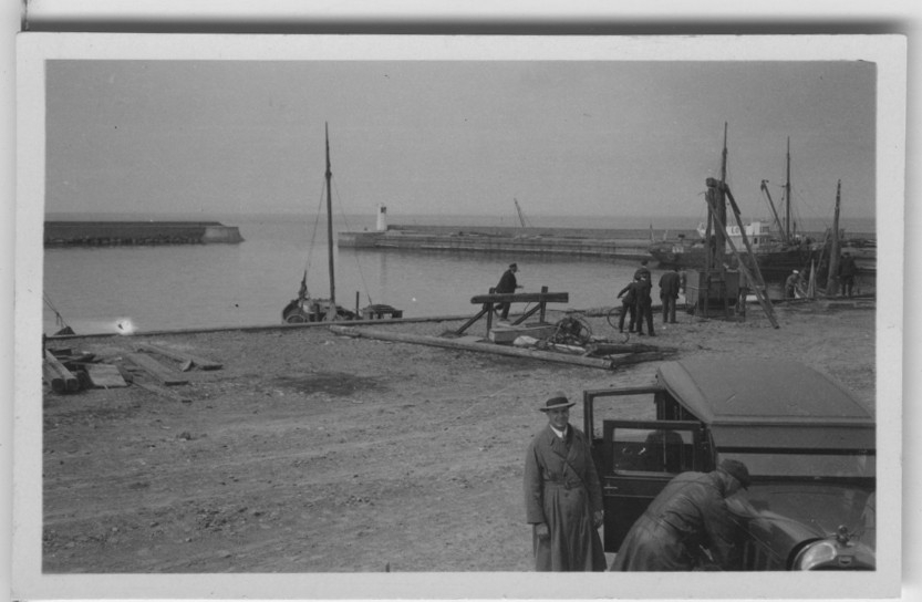 'Göteborgs Biologiska förenings utfärd till Måkläppen och Falsterborev: :: :: Skanörs hamn. Vy ut mot havet. I förgrunden 2 män vid 1 bil. Båt i vattnet. :: :: Se fotonr. 1384-1395, 1618-1639, 1640-1648 samt 3229 från samma utfärd.'