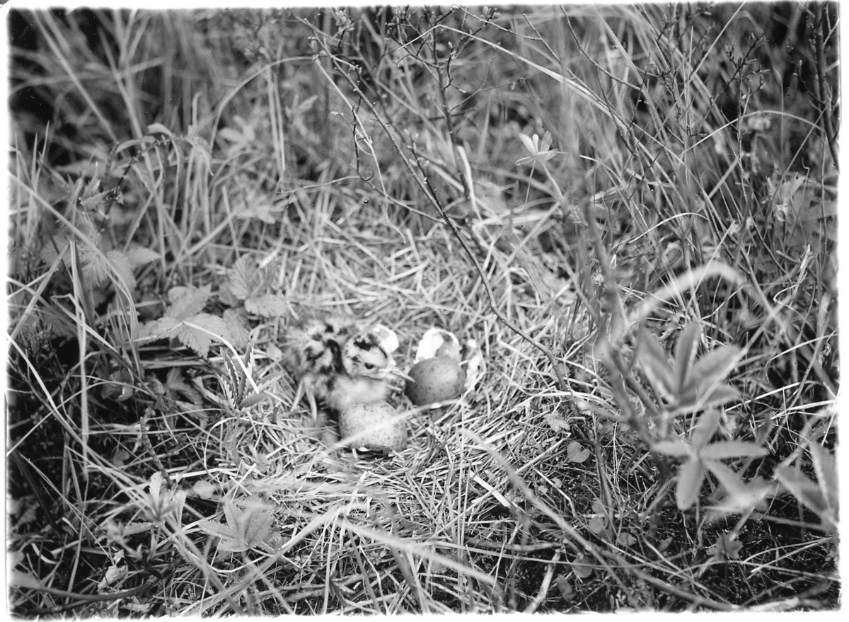 'Bo med 1 st unge och ägg av storspov omgivet av örtvegetation. :: :: Ingår i serie med fotonr. 2242-2244.'