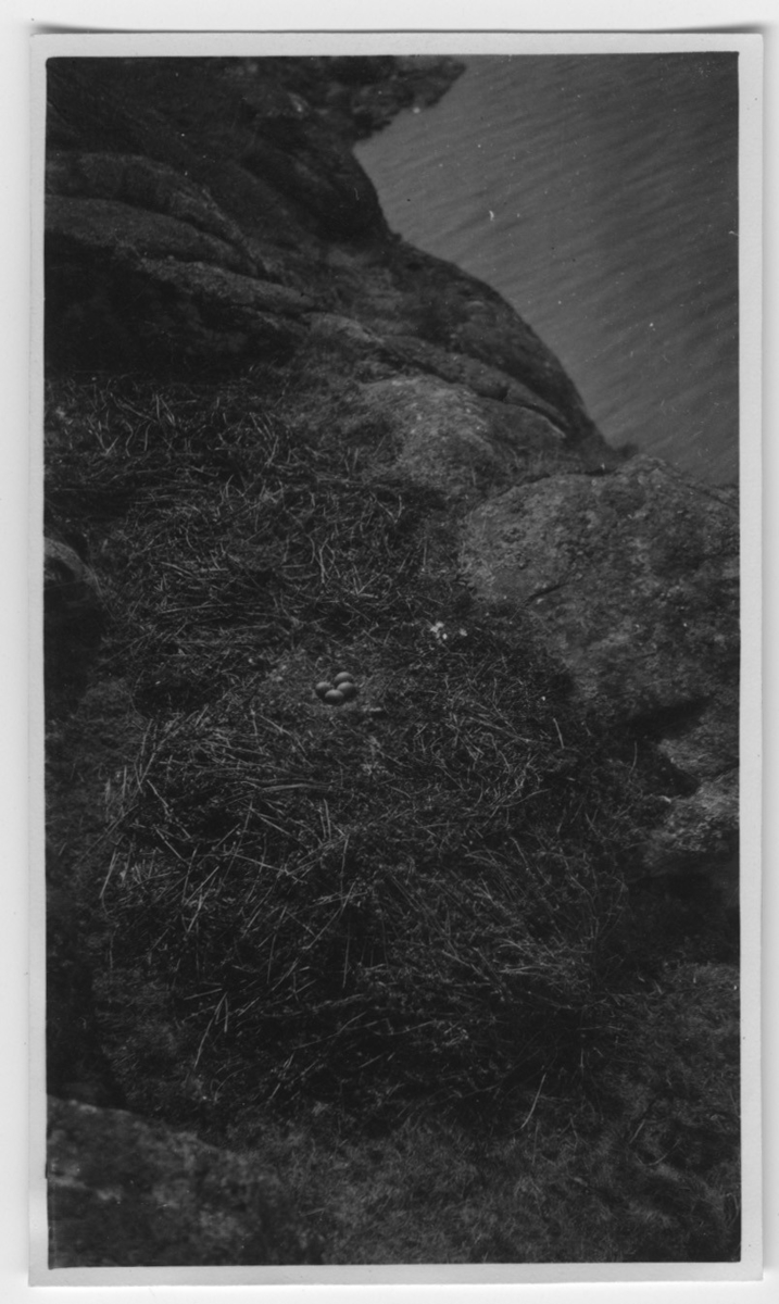'Bo med 4 st ägg av pilgrimsfalk. På avstånd., vy med vatten. :: :: Ingår i serie med fotonr. 2257-2261.'