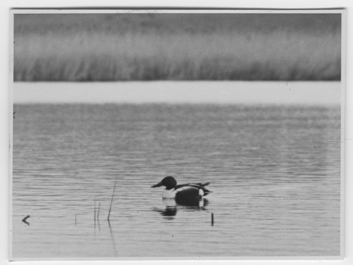 'Simmande skedand i sjön. Sedd från sidan. Vassbälte i fonden. :: :: Ingår i serie med fotonr. 2272-2304.'