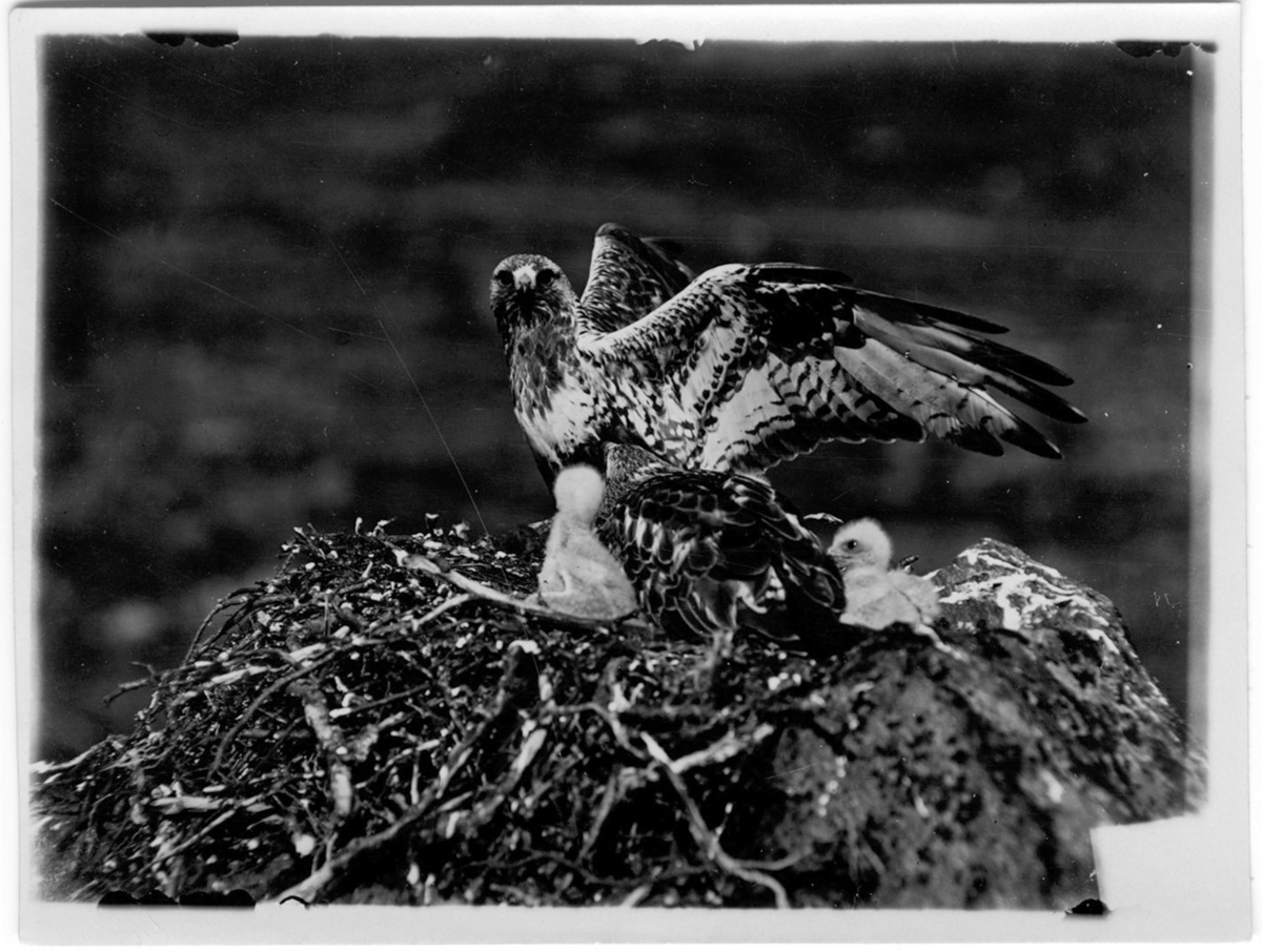 'Hane, hona och minst 2 st dunungar i boet, närbild. :: :: Ingår i serie med fotonr. 1690-1708.'