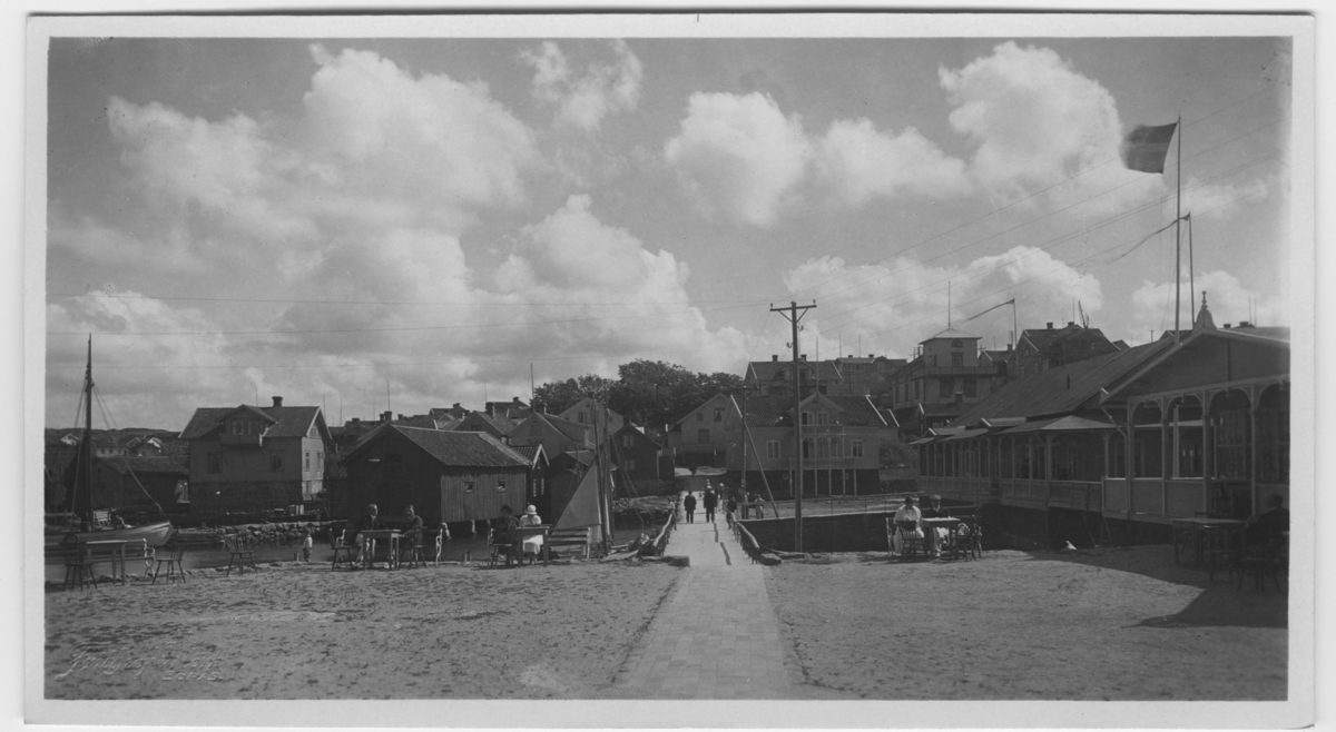 'Restaurangen från ångbåtsbryggan. Bebyggelse och öppen plan med människor (män, kvinnor och barn) vid bord och stolar. Hus. Båtar. Mast. Segel. Träbänk. Elledning. :: :: Serie fotonr 1888-1963.'