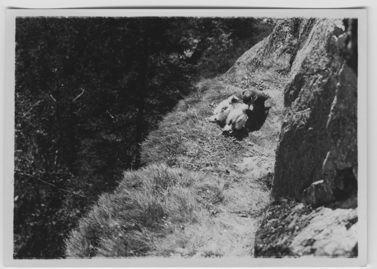 'Pilgrimsfalk, honan matar 2 ungarna. Text på baksidan ''När falkungarna äro halvvuxna måste även honan skaffa föda åt ungarna. Var hon frånvarande, som här är fallet, styckade hanen det medförda rovet.'' :: :: Se serie med fotonr. 3151-3200. Se även fotonr. 1771-1837.'