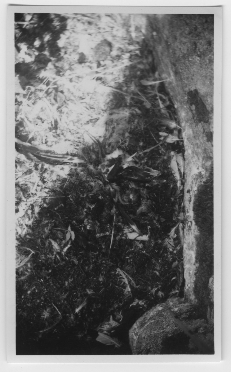 'Bo av pilgrimsfalk sett ovanifrån. :: :: Text på baksidan av fotot: ''Pilgrimsfalkboet efter 5 veckor. I mitten av fotot ligger en halväten skata och man ser ena benet till höger samt halva näbben. Jag räknade till 5 skator, som hannen slagit. En enda fjäder av en duva såg jag vid boet. Fotot taget med 90 cm linsen.'' :: :: Ingår i serie med fotonr. 4500:1-172.'