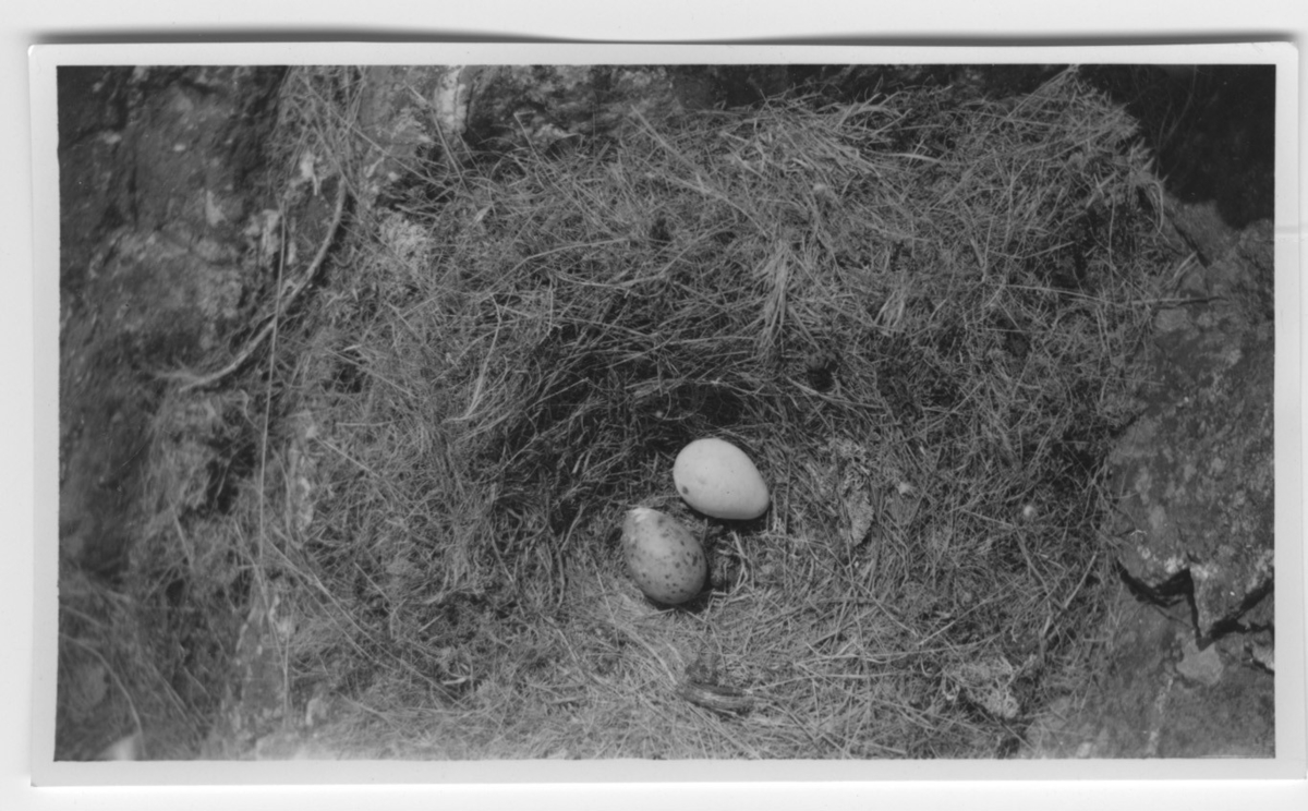 'Bo med 2 ägg. Enligt bildtext: ''Gråtrutens bo med 2 ägg, varav det ena var ljusblått, på stora Trollön. Kolonin består av ca 300 par häckande trutar. Bland annat var det fullt med trutar i falkberget.'' :: :: Ingår i serie med fotonr. 4401-4440.'