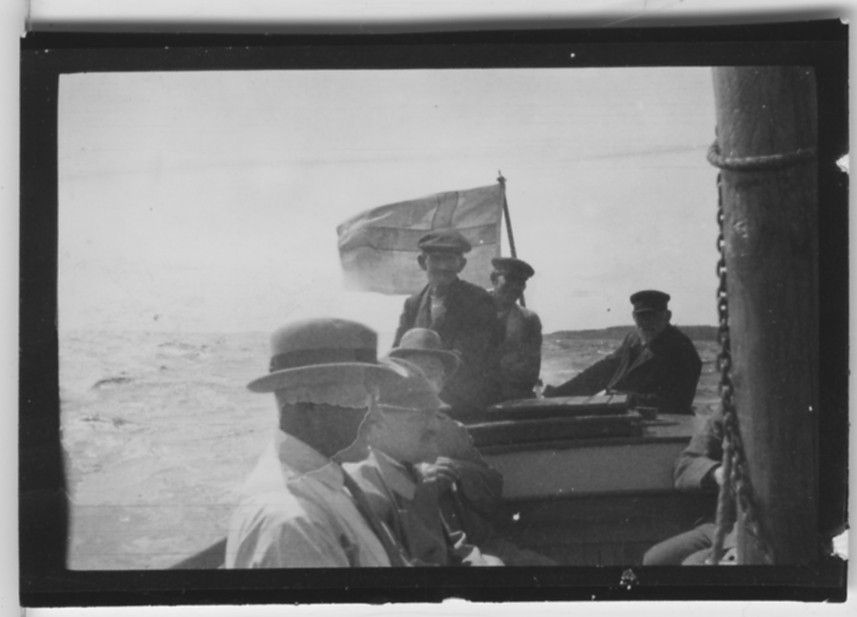 'Biologiska föreningens utfärd till Hallands Väderö: :: :: 6 män sittande på båtdäck. Flagga i bakgrunden. :: :: Se fotonr. 1464 och 4311:1-58 från samma utfärd.'