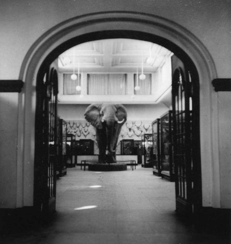 'Den monterade elefanten i däggdjurssalen. :: :: Fotograferad från avstånd, in genom dörrarna ledande till däggdjurssalen.'