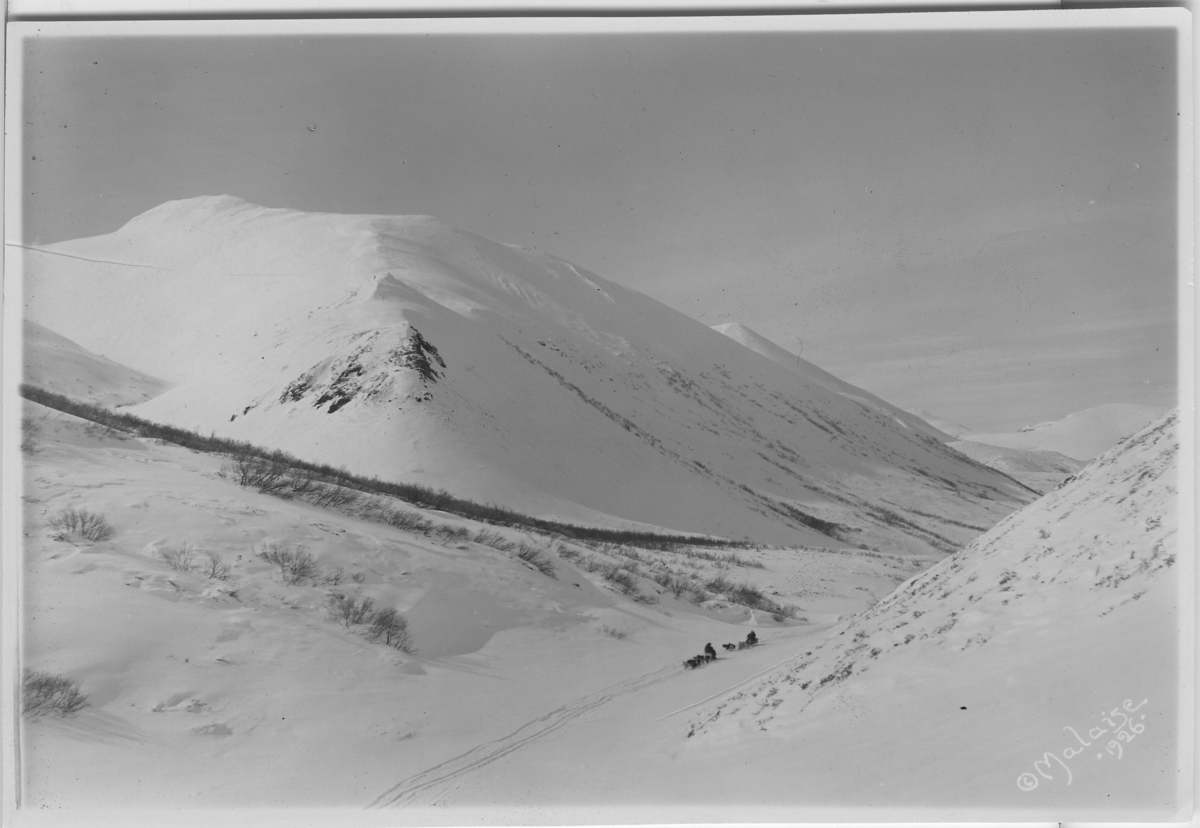 'Fjällvärld i snö med 2 hundslädar på avstånd. :: (8) :: :: Serie fotonr 4916-4930. :: Kartskiss fotonr. 4916:1 visar motivens läge.'
