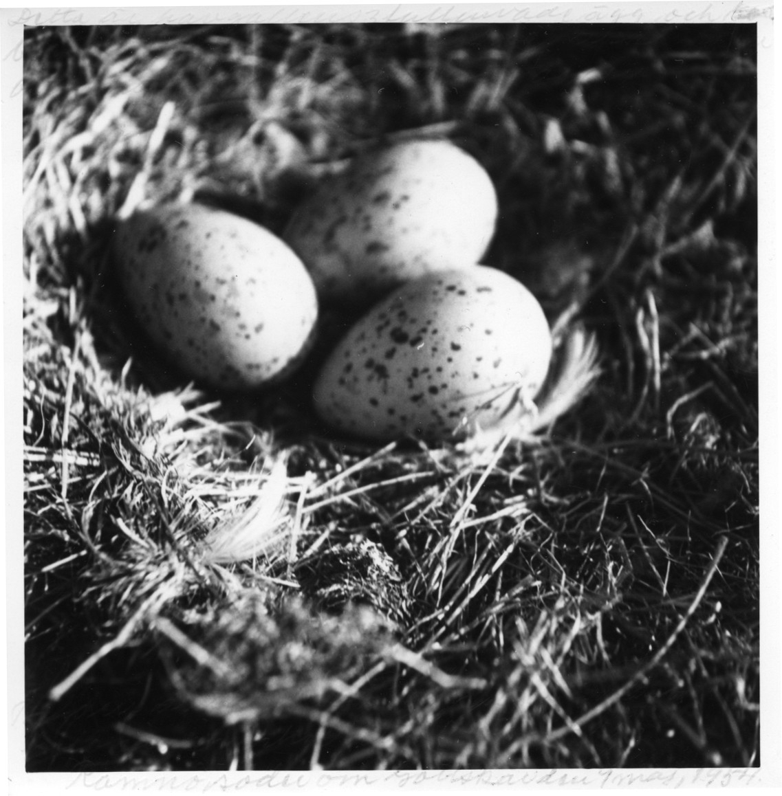 'Enligt anteckning på fotografiets baksida: :: ''Detta är havgallens tre fullruvade ägg och boet låg i en bergskreva högt uppe på en bergknalt. :: Fjädrar syns vid äggen. :: Bilden är tagen på 33 cm avstånd. Kolonien innehöll ett 20-tal par.'' :: :: Ingår i en serie med fotonr. 4512:1-57 med diverse foton av fågelbon med ägg och ungar. Varje fotografi har utförliga anteckningar på sin baksida, kopierade från framsidan, spår av de på framsidan är fortfarande synliga.'