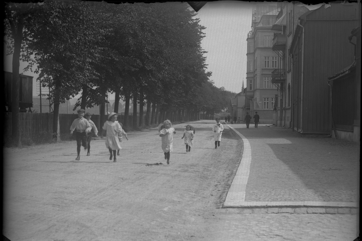 'Vy med gata. I förgrunden 7 springande barn på gatan, pojkar och flickor iklädda hattar och mössor. På trotoarren går 2 män iklädda käpp och hattar. På avstånd en grupp personer ca 10 st barn och vuxna som går på trotoarren. På ena sidan om gatan en rad träd, allé, och staket, elstolpar på andra sidan. Till höger om gatan trähus. :: :: Ingår i serie med fotonr. 5140:1-39.'