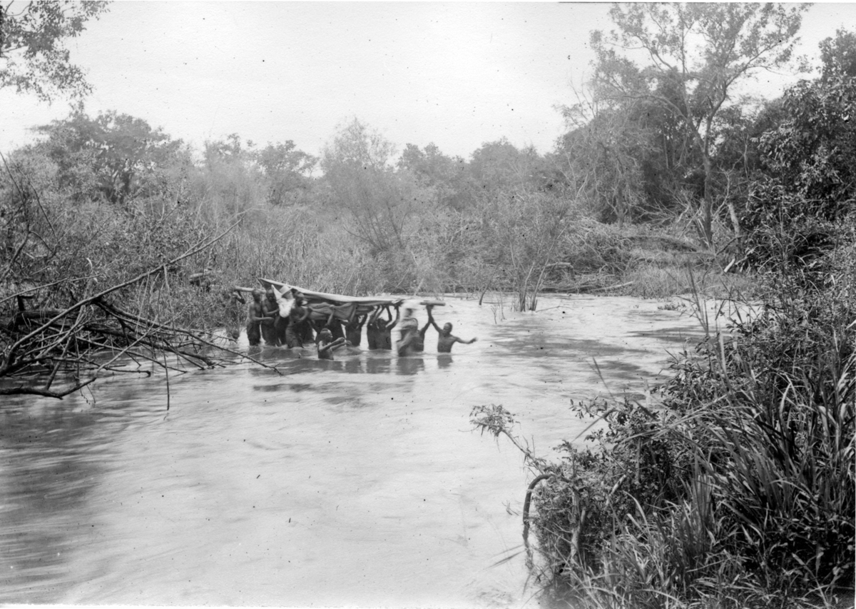 'Diverse fotografier från bl.a. dåvarande Nordrhodesia, nu Zambia, tagna av Konsul Magnus Leijer. :: :: Drygt 13 st män bär 1 st kvinna (?) i en hängmatta över ett vattendrag.'