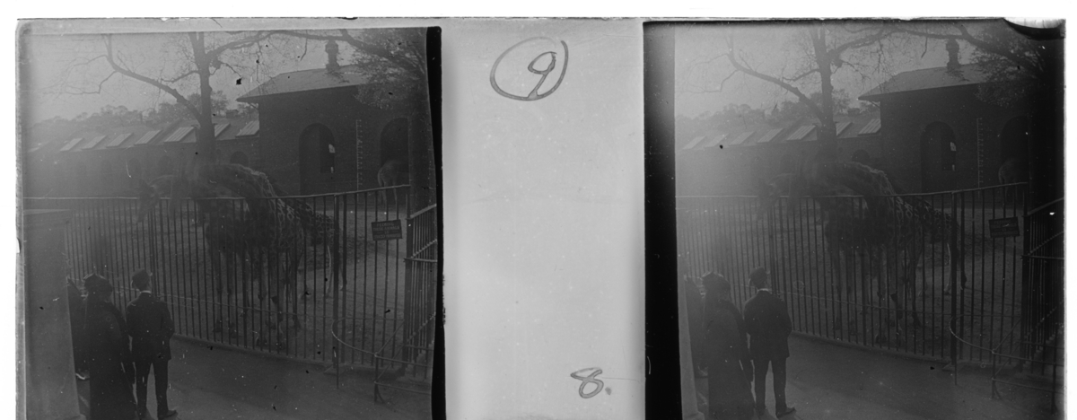 'Åskådare framför giraffhägn. 3 giraffer bakom staketet, sträcker huvuden över staketet, och i bakgrunden ytterligare 1 giraff på väg in i byggnad. Skylt talar om att det är förbjudet att mata djuren. På väggen syns någon form av mätstock från marken och uppåt. :: Enligt text till fotot: ''Giraffes.'' (Giraffer.) :: :: Ingår i serie med fotonr. 5244:1-19, se även hela serien med fotonr. 5237-5267.'
