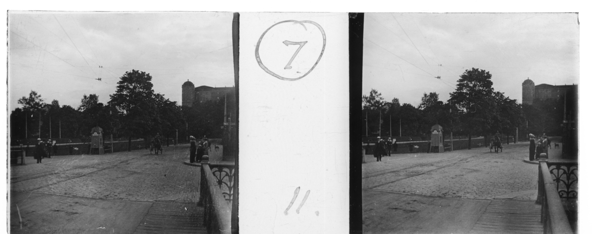 'Vy med människor, 3 kvinnor och 1 flicka samlade på trottoar nedanför slottet , Munkgatan vid Svandammen. Gata med häst och vagn samt andra människor. Telefonkiosk. :: Enligt text till fotot: ''Castle, from bridge.'' (Slottet sett från Islandsbron.) :: :: Ingår i serie med fotonr. 5247:1-20, se även hela serien med fotonr. 5237-5267.'