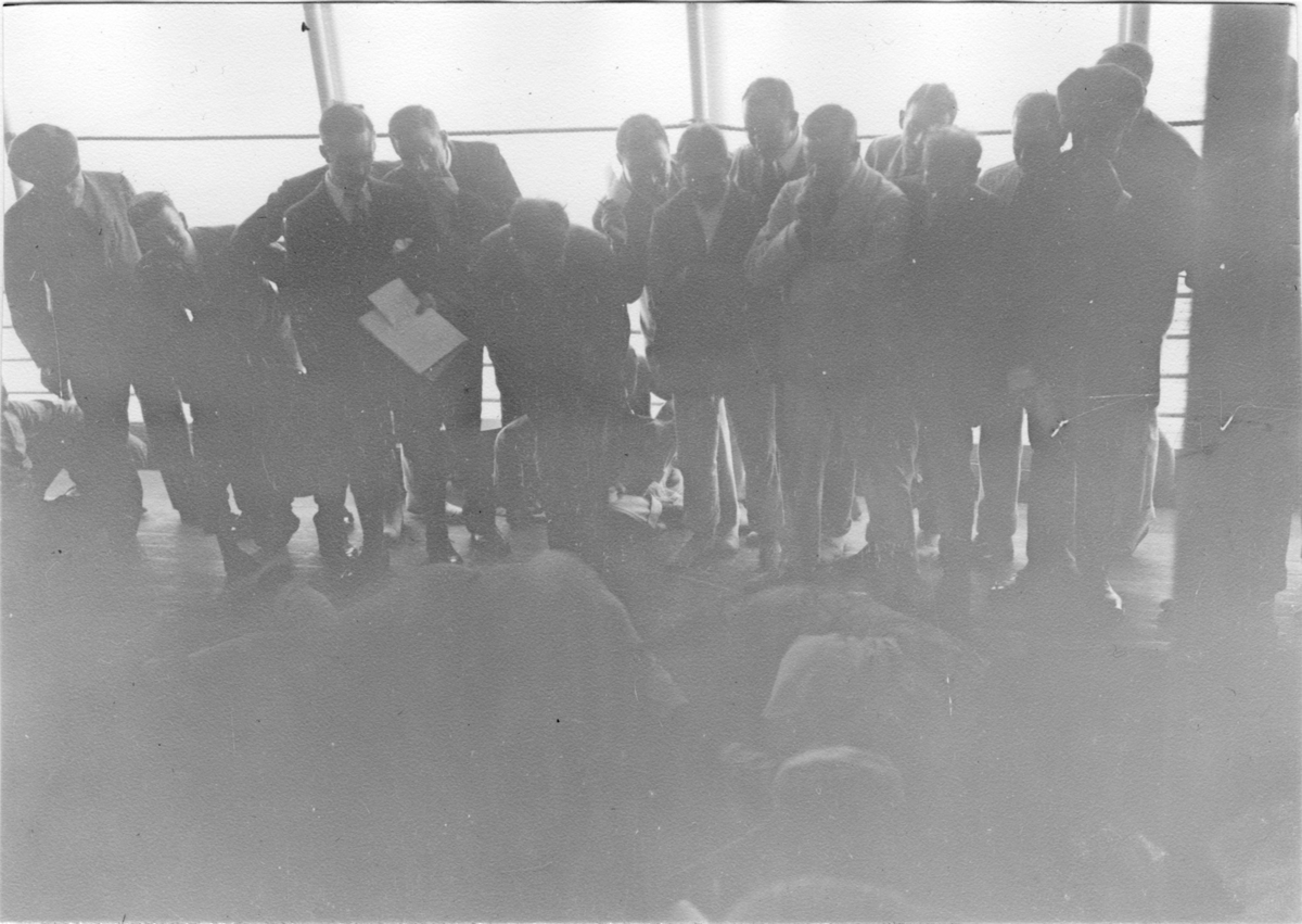 'Diverse fotografier från bl.a. dåvarande Nordrhodesia, nu Zambia, tagna av Konsul Magnus Leijer. :: :: En grupp män, ståendes, tittandes på något.'