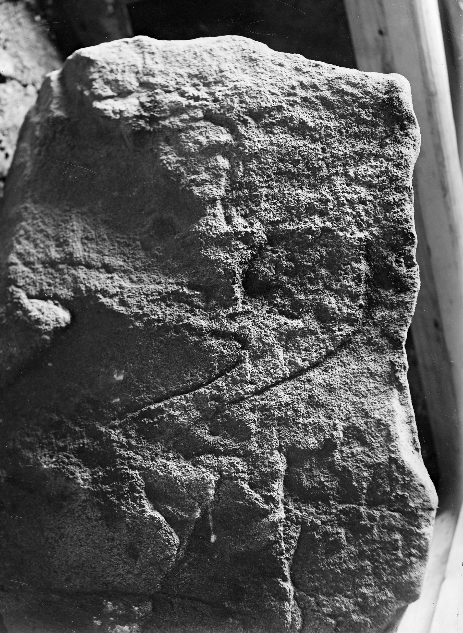 Hög, RAÄ-nummer Hasslöv 3:1. Norra sidostenen i kistan med inhuggen linje.