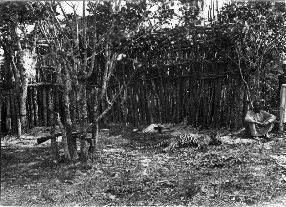 'Diverse fotografier från bl.a. dåvarande Nordrhodesia, nu Zambia, tagna av Konsul Magnus Leijer. :: :: Mellan trädstammar uppspända gevär med snören till avtryckaren, vid en väg av trästammar ligger ett fällt getdjur samt ytterligare ett djur (leopard?), 2 män är synliga vid sidan av.'