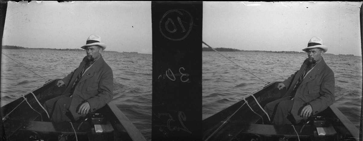 'Bildtext: ''Romney vid rodret.'' :: I förgrunden båt med 1 man i fören, hattklädd och med pipa. :: :: :: Ingår i serie med fotonr. 5261:1-14. Se även hela serien med fotonr. 5237-5267.'