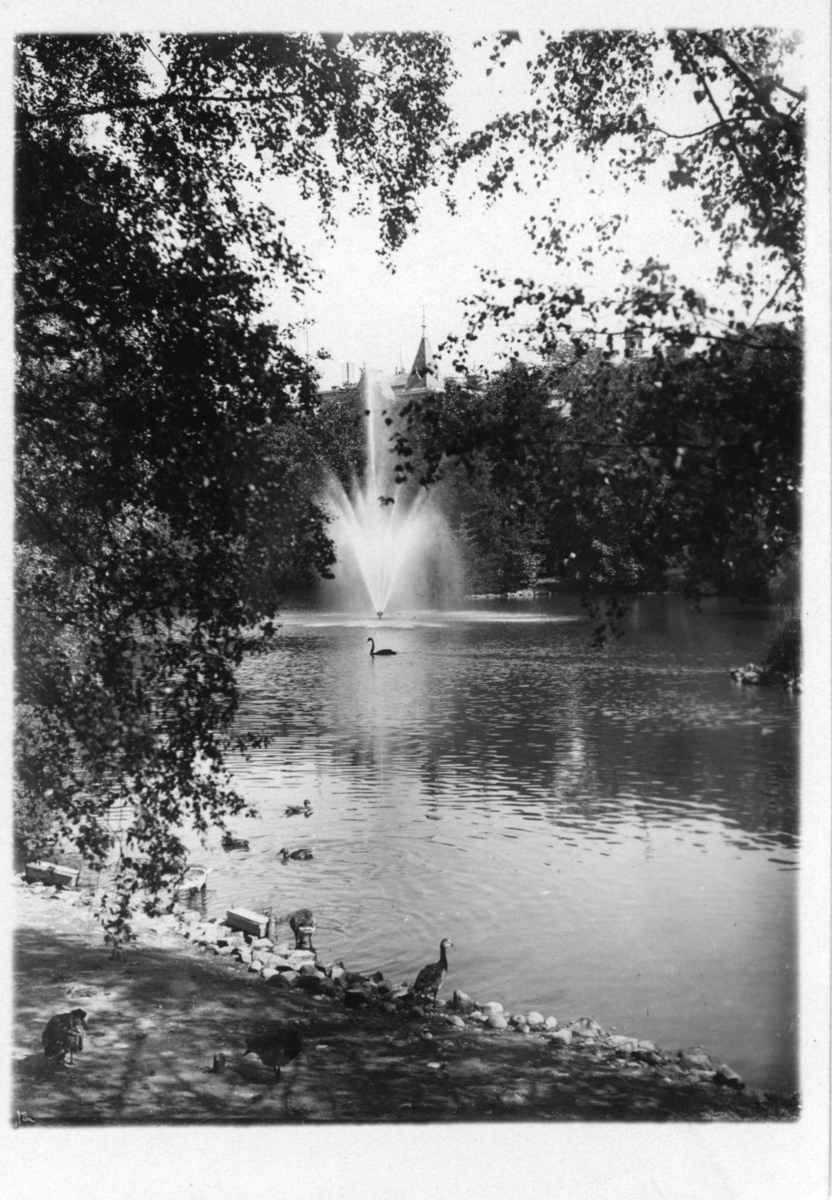 Vy med fontän i Stora fågeldammen. I bakgrunden syns kvarteret Slottsskogsledet med hörnhusen vid Linnéplatsen.