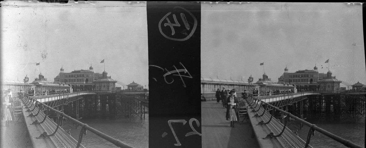 'Bildtext: ''Brighton.'' :: Vy med pir där människor promenerar. I bakgrunden hus, byggnader. Gatlykta. Flagga. Räcke. :: :: Ingår i serie med fotonr. 5263:1-16. Se även hela serien med fotonr. 5237-5267.'