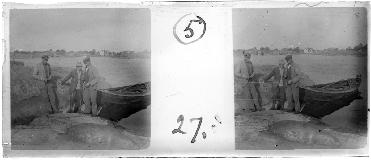 'Bildtext: ''Sälen är färdig att späckas.'' :: Vy med 3 hattklädda män stående på berhäll med en död säl liggande på hällen. I fonden hus. :: :: Ingår i serie med fotonr. 5263:1-16. Se även hela serien med fotonr. 5237-5267.'