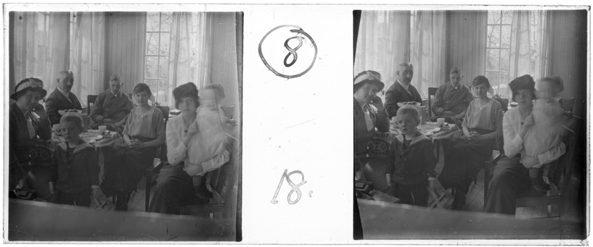 'Bildtext: ''Flottsund: kaffe på verandan.'' :: Grupp personer samlade vid kaffebord på inglasad veranda. I gruppen 3 kvinnor, 1 litet barn, 1 äldre och 1 yngre man, 1 pojke. I bakgrunden glasfönster med gardiner. På bordet duk, kaffekoppar, fruktfat. Trästolar. Kläder. Möbler. :: :: Ingår i serie med fotonr. 5254, se även hela serien med fotonr. 5237-5267.'