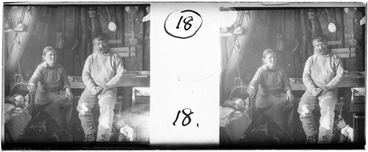 'Bildtext: ''Lappkåta, interiör (P. Möller fot.'' :: 1 kvinna och 1 man sittande inne i lappkåta med 1 barn i en vagga. På väggen hänger diverse husgeråd. Kläder. :: :: Ingår i serie med fotonr. 5254, se även hela serien med fotonr. 5237-5267.'
