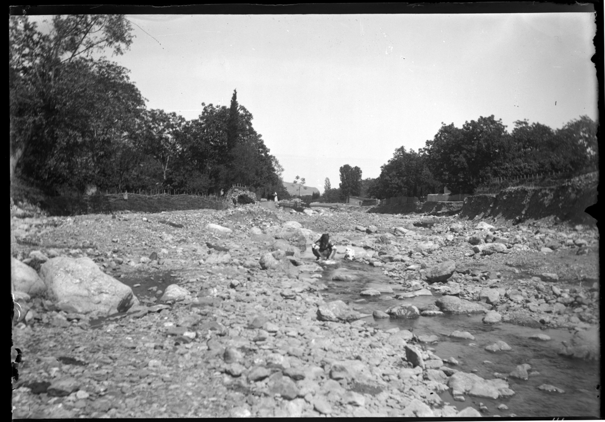 'Vy över flodbädd, uttorkad. Vid vattnet sitter 1 fllicka, tvättar. På avstånd syns hägnad längs flodfåran. :: :: Ingår i serie med fotonr. 5276:1-20. Se även fotonr. 5269-5292 med bilder från Stuxbergs resa till Kaukasien.'
