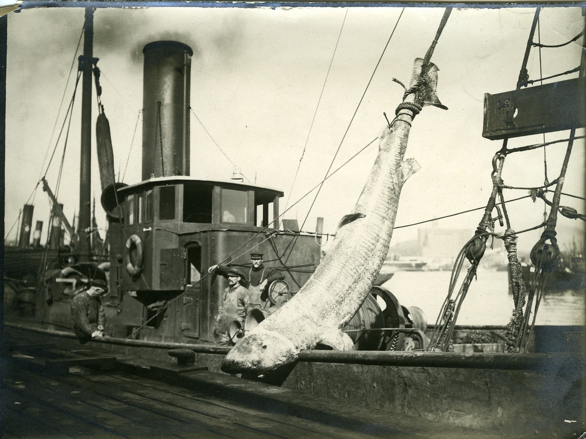'Håkäring ,4 m lång, hissas upp ur fiskebåt. På båtdäck står 3 män. I fonden skymtar byggnader. Skorsten. Livboj. :: :: Se även fotonr. 544:2..'