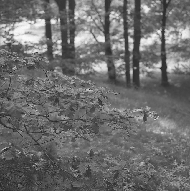 'Ekbacken och en bild på stora blocken utanför entrén. :: :: Vy över ekbacken med ekblad i förgrunden.'