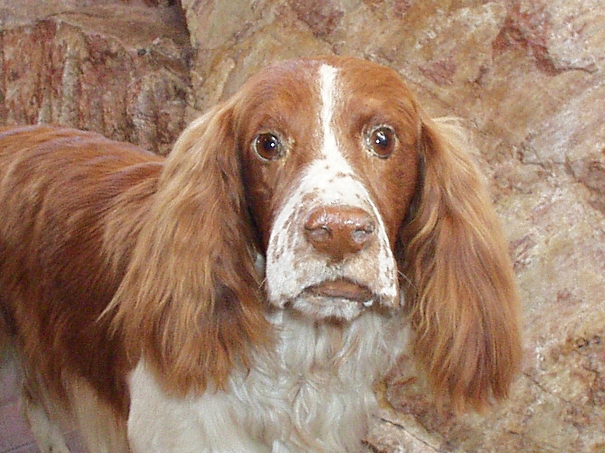 'Welsh Springer Spaniel, hane, 5 år, monterad på 1960-talet. Monterad av Gunnar Gustafsson. Gåva till museet från Torsten Ahlström, Hisings Backa. Huvudbild, framifrån. :: :: Fotot med i artikel i Welsh Nytt nr 2 år 2004 s. 4. :: :: Se även fotonr. 6071:2. Ingår i serie med fotonr. 6071:1-3.'