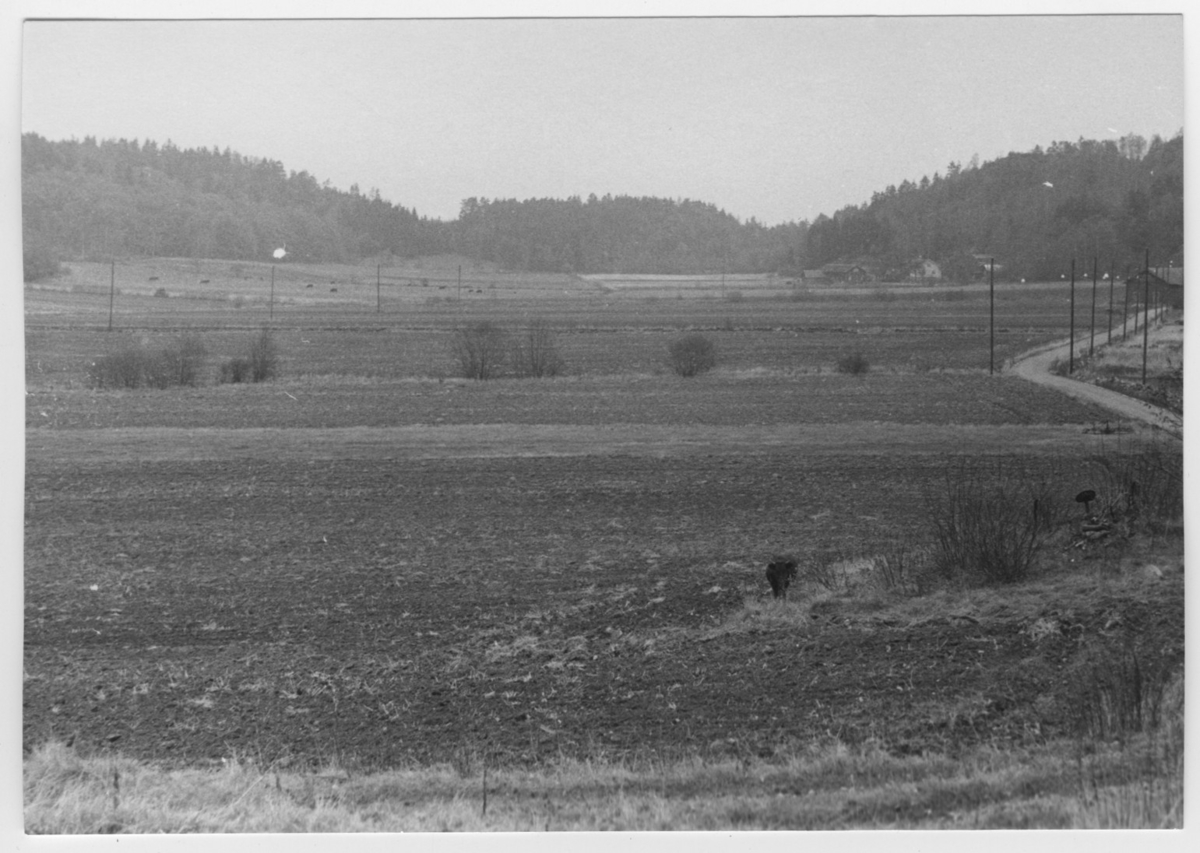 'Bildtext: ''Djupadal. Sedimentslätt. Riktning 7.'' :: Vy över öppna fält, åkermark och på avstånd hus, ev gård. Ev betande boskap på avstånd. I fonden trädbevuxna berg. :: :: Ingår i serie med fotonr. 6970:1-1125, dokumentation av Hisingens naturgeografi, visande landskapsformerna i stora drag och gjord inför exploateringen av området. Platserna för fotograferingen finns utsatta på karta i skala 1:4000 som finns på Göteborgs Naturhistoriska musem. Fotoriktningen mättes med kompass i gammalgrader.'