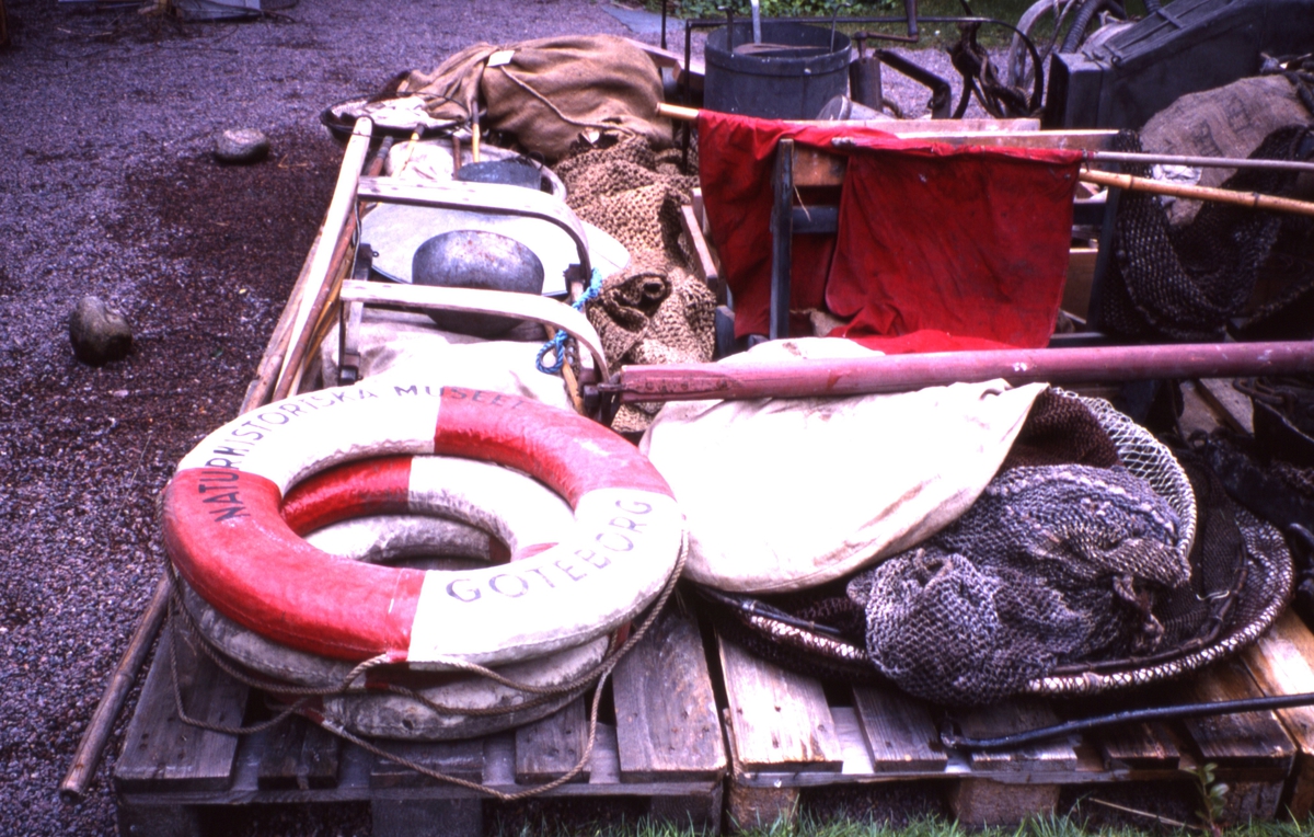 'Leonard Axel Jägerskiölds material och redskap: :: Samling av redskap använda under Jägerskiölds marina inventeringar. Marina undersökningar. Livboj. :: :: Ingår i serie med fotonr. 6950:1-14.'