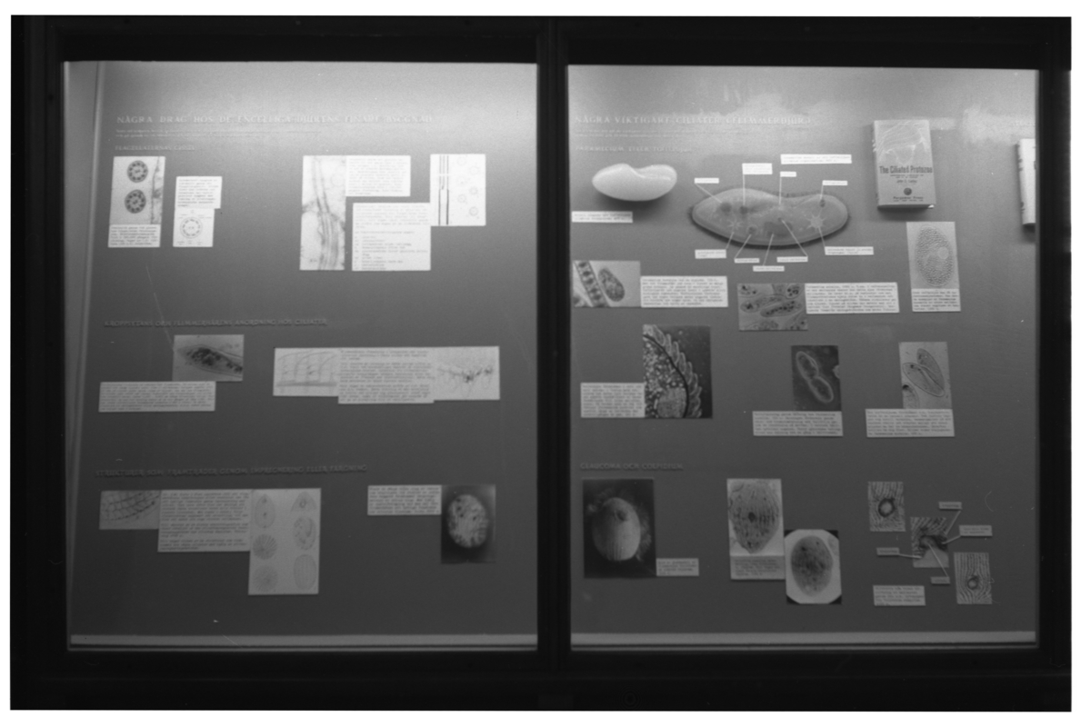 'Monter med titel ''Några drag hos de encelliga djurens finare byggnad'' och '''' och ''Några viktigare ciliater (flimmerdjur)'' I monter 11 (år 2007). :: :: Ingår i serie med fotonr. 6962:1-6.'