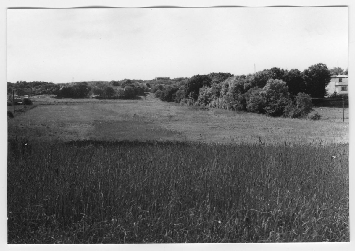 'Bildtext: ''Sedimentplan med äng och lövskog. Riktning 232.'' I förgrunden öpppna fält och i fonden trädvegetation och spridda hus. :: :: Ingår i serie med fotonr. 6970:1-1125, dokumentation av Hisingens naturgeografi, visande landskapsformerna i stora drag och gjord inför exploateringen av området. Platserna för fotograferingen finns utsatta på karta i skala 1:4000 som finns på Göteborgs Naturhistoriska musem. Fotoriktningen mättes med kompass i gammalgrader.'