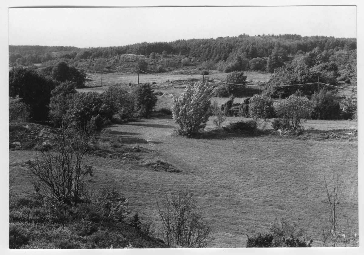 'Bildtext: ''Betesmark i dalgång. Riktning 309.'' :: Vy över betesmark med öppna gräsytor med dungar med träd och buskar. :: Ingår i serie med fotonr. 6970:1-1125, dokumentation av Hisingens naturgeografi, visande landskapsformerna i stora drag och gjord inför exploateringen av området. Platserna för fotograferingen finns utsatta på karta i skala 1:4000 som finns på Göteborgs Naturhistoriska musem. Fotoriktningen mättes med kompass i gammalgrader.'