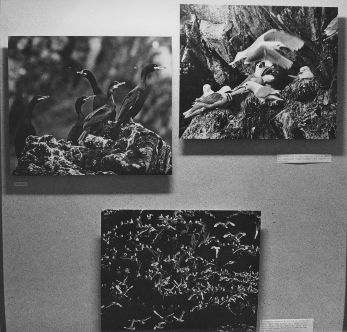 'Avfotografering av utställningen: Rundøy -fågelö på Skandinaviens västkant, 1966-10-22-1966-12-15: :: :: 3 st foton visande 5 st toppskarvar på klippa, ca 6 st tretåiga måsar samt foto visande stort fågelmoln av tretåiga måsar. :: :: Ingår i serie med fotonr. 6982:1-19.'