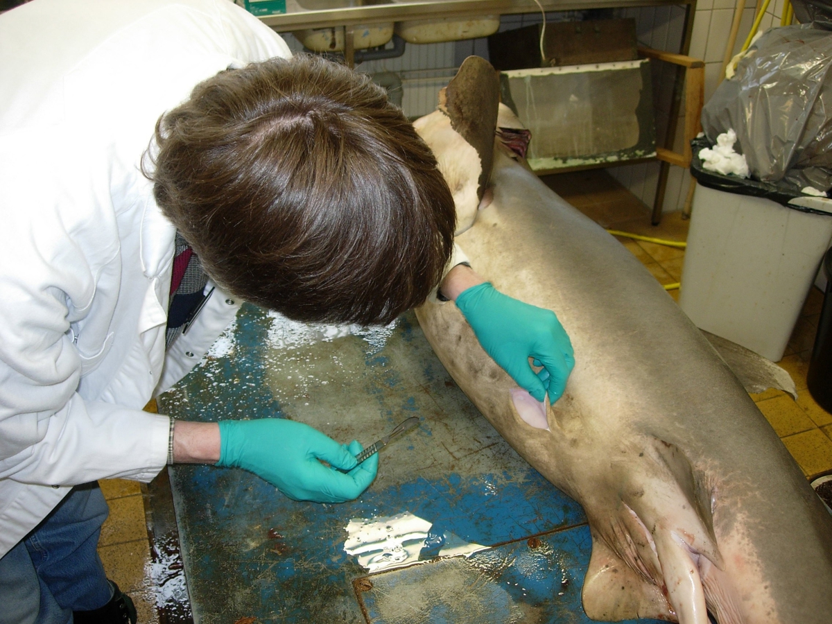 'Arbete med avgjutning av vitspetsad oceanhaj: :: Kroppen på väg att öppnas med ett snitt. :: :: Ingår i serie med fotonr. 7108:1-24.'