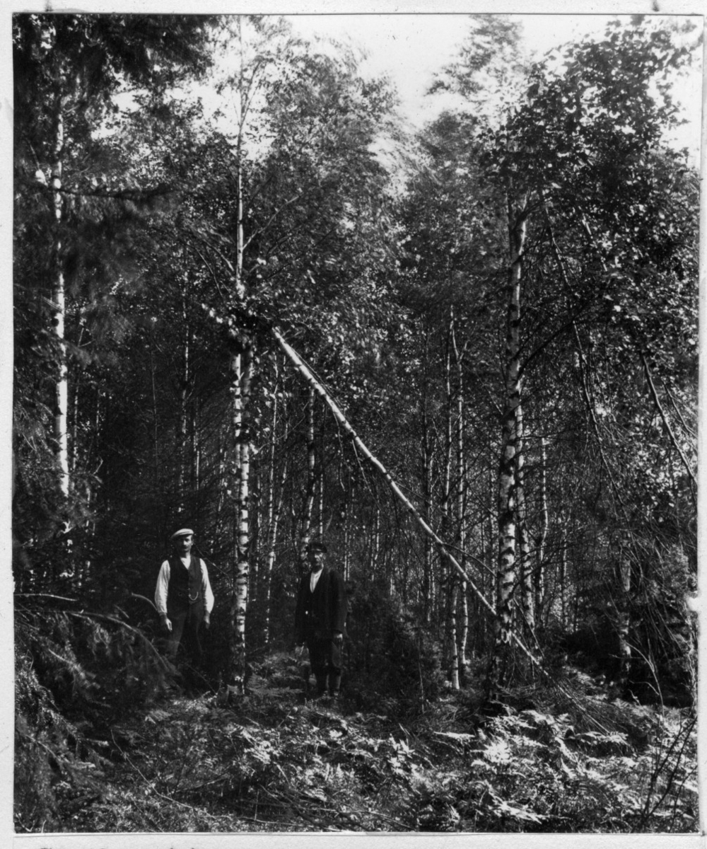 'Bildtext: ''Snöbrott.'' 2 män stående invid björkbestånd där vissa träd knäckts av snötyngd. :: :: Fotonr. 7047:2-23 indelad under rubriken ''Atmosfäriska skador på skogen, skogseld och släckning därav.'' Ingår i serie med fotonr. 7046:1-383, 7047:1-33 och 7048:1-67 med bilder från Länsjägmästare John Lindners bildarkiv.'