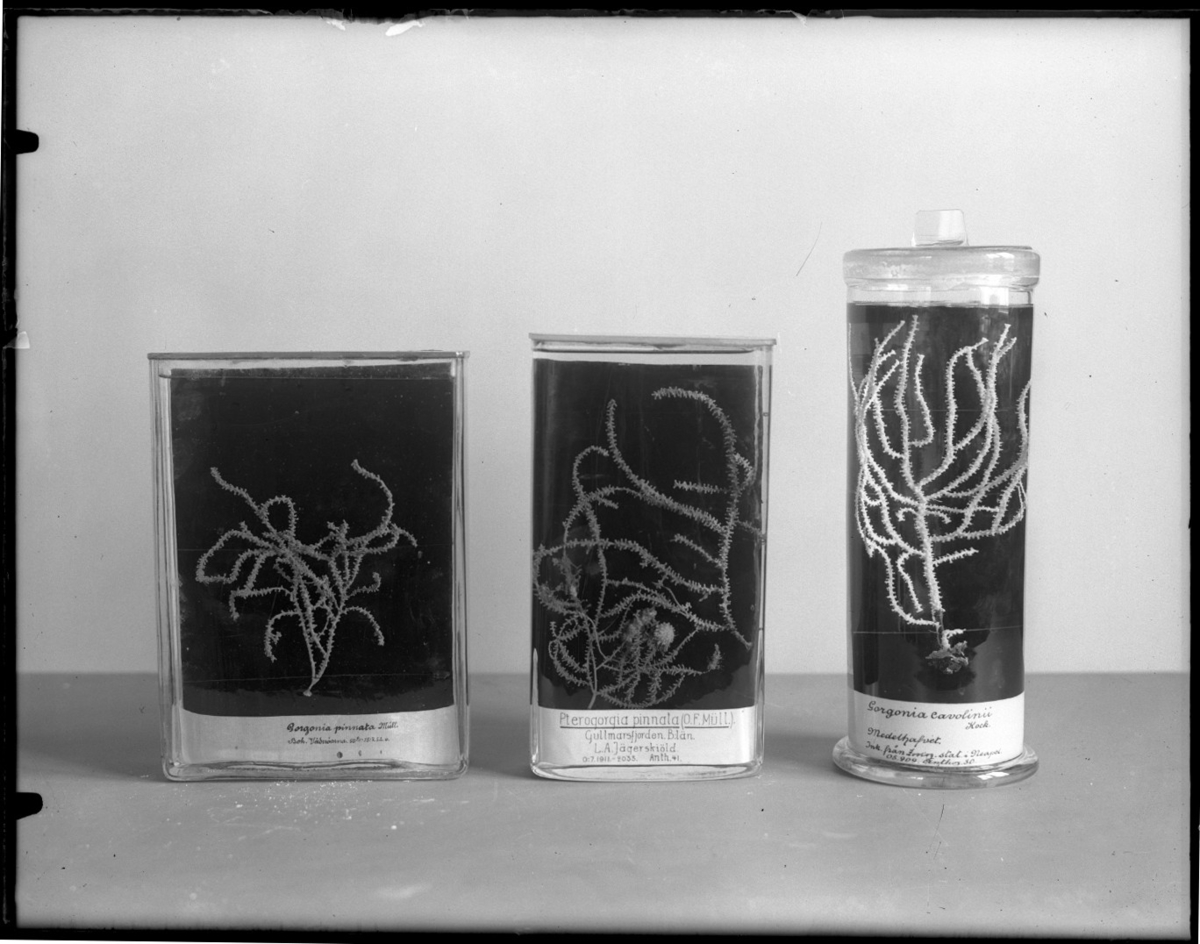 'Längst till vänster: :: Gorgonia pinnata (Müll.), Fyndplats: Bohuslän, Väderöarna. :: Gorgonacea. :: :: I mitten: :: Pterogorgia pinnata (O.F. Müller). Fyndplats: Bohuslän, Gullmarsfjorden. Gen.kat.nr. 1911-2033. (Anth.41) nu gällade nr: Anthoz.642. 1911-07-00.3 st preparat. Annan. nr. 41. :: Längst till höger: :: Gorgonia cavolinii (Kock). Fyndplats: Italien, Medelhavet, Zool.station, Kampanien, Napoli, Neapel. Annan. nr. 30. Gorgonacea, hornkorall. (Anthoz.30) nu gällade nr: Anthoz.640.'