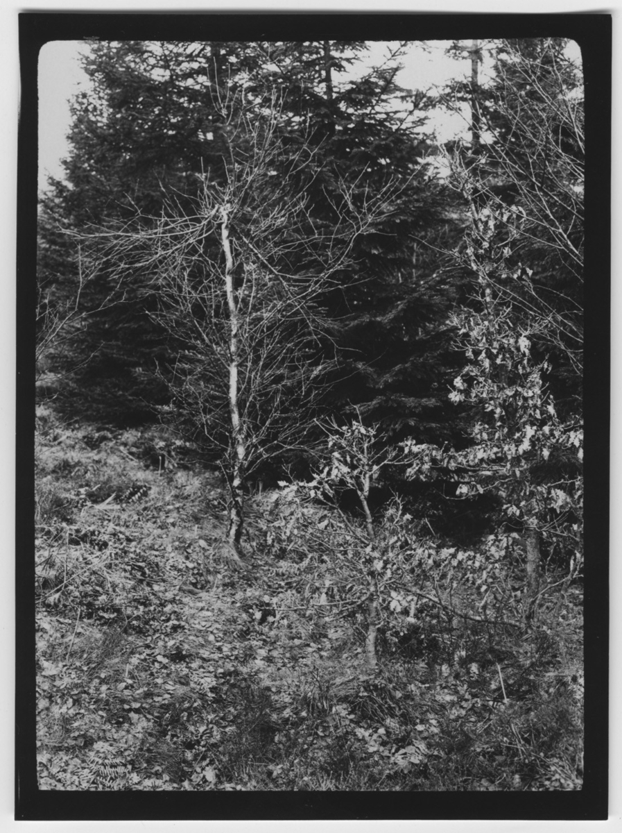 'Avbruten björk, gran i bakgrunden. Text på baksidan: ''Av älg skadade, en stycken björk och 2 stycken ekar.'' :: :: Ingår i serie med fotonr. 2347-2399.'