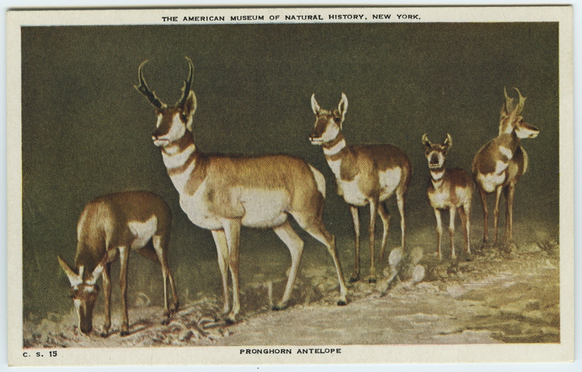 '5 antiloper i närbild, hane, hona och ungar. Text på baksidan: ''Pronghorn antelope. The American antelope, once abundant on the Western plains, is nearing extinction. Group of male, female and young.'' :: :: Ingår i serie med fotonr. 2941-2954. Se även serie med fotonr. 2930-2940 med vykort delvis samma motiv, icke kolorerade.'