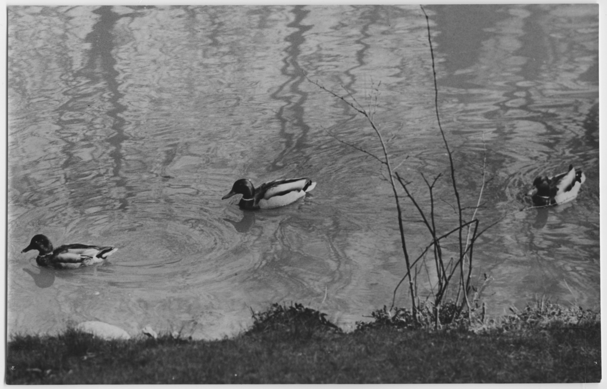 3 st gräsänder i fågeldammen i Slottsskogen. Närbild.