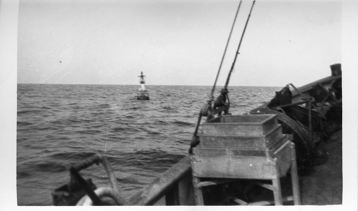 'Akka-expeditionen sommaren 1932: :: :: Havsvy med Lilla Middelgrunds lysboj. Sållbordet på båtdäck. :: :: Ingår i serie med fotonr. 2400-2453.'