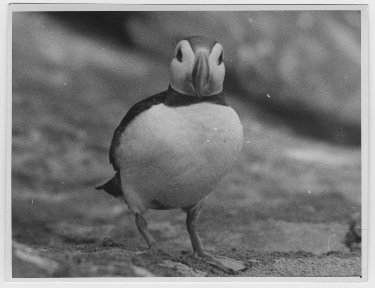 '1 st lunnefåglel sedd rakt framifrån, närbild. :: :: Se serie med fotonr. 3726-3729.'
