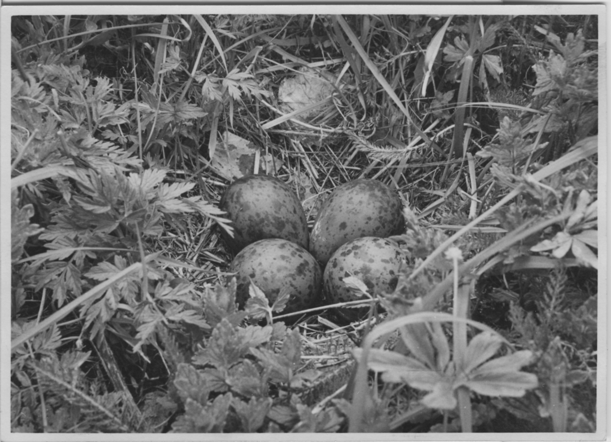'Biologiska föreningens utfärd till Tåkern, Vadstena m.fl. platser: :: :: Bo med 4 ägg av storspov, närbild med boet liggande i örtvegetation. :: :: Se fotonr. 3588-3634 samt 3661-3677.'