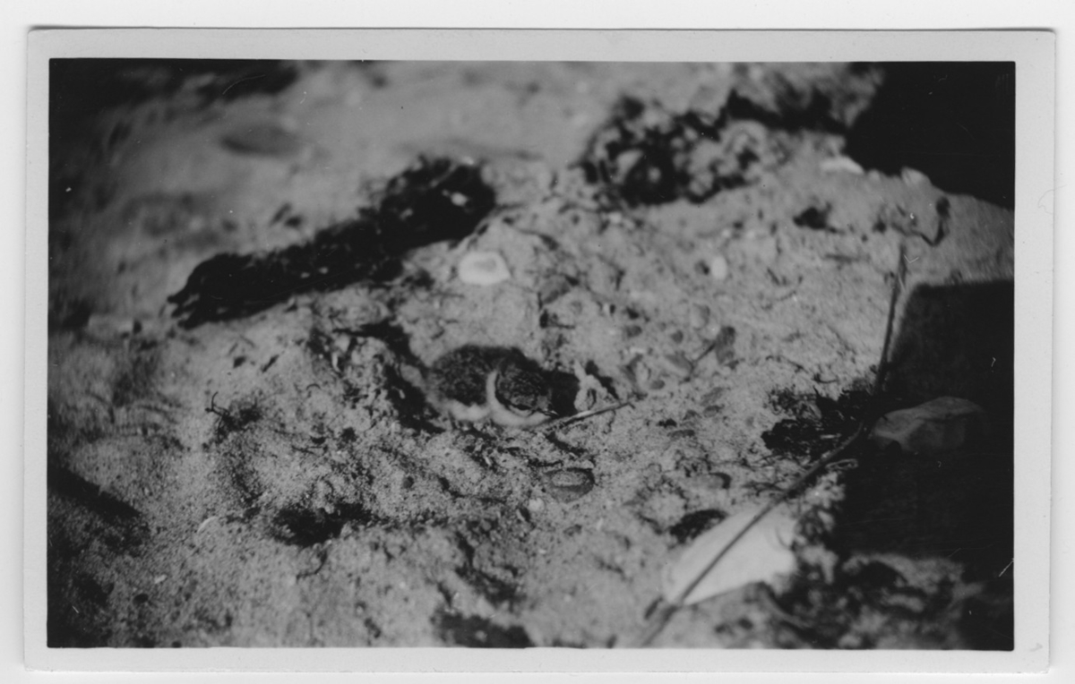 '1 st unge av större strandpipare i sand. :: :: Text på baksidan av fotot: ''1 st ca 3 dagar gammal större strandpiparunge trycker i sanden på en sandrevel. Fotot taget med 40 cm lins.'' :: :: Ingår i serie med fotonr. 4500:1-172.'