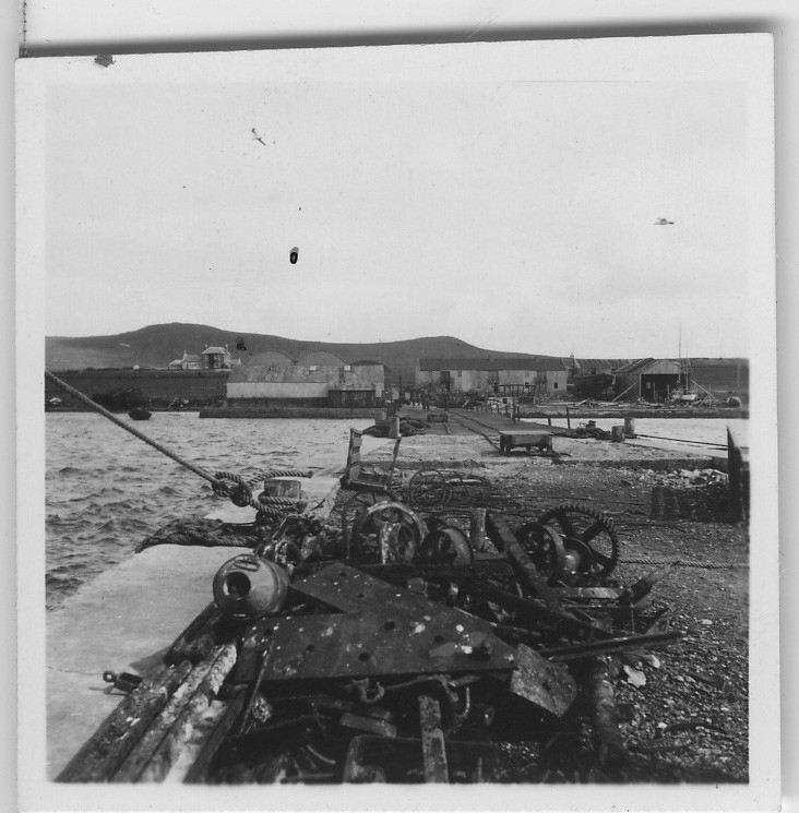 'Från ''Skageraks''-expeditionen till Hebriderna och Shetland: :: :: Bryggan i Balta sound med redskap, byggnader och lagerskjul synliga. Människor och byggnader i bakgrunden. :: :: Ingår i serie med fotonr. 4113:1-82.'