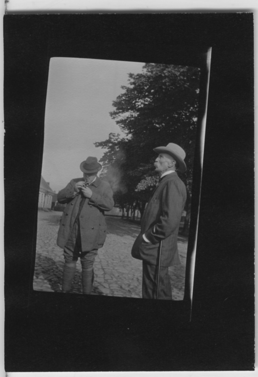'Biologiska föreningens utfärd till Hallands Väderö: :: :: 2 män varav en med pipa. Står på kullersten, i bakgrunden byggnad. Kläder. Klädsel. :: :: Se fotonr. 1464 och 4311:1-58 från samma utfärd.'
