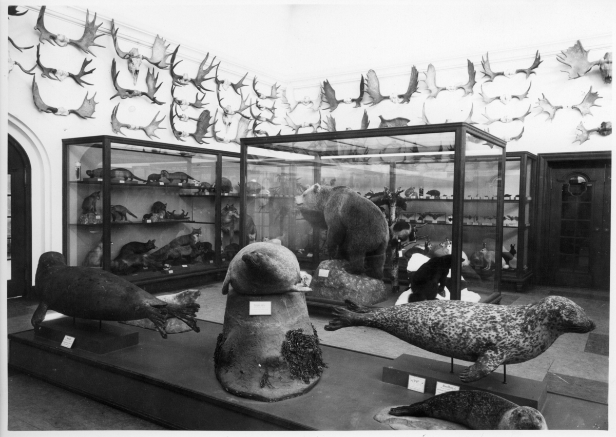 Del av däggdjurssalen med sälar och glasmontrar med bl.a. björn. På väggarn bakom hänger horn. Monter i bakgrunden med fladdermöss och smågnagare. Mpnter till vänster med varg och räv bl.a.