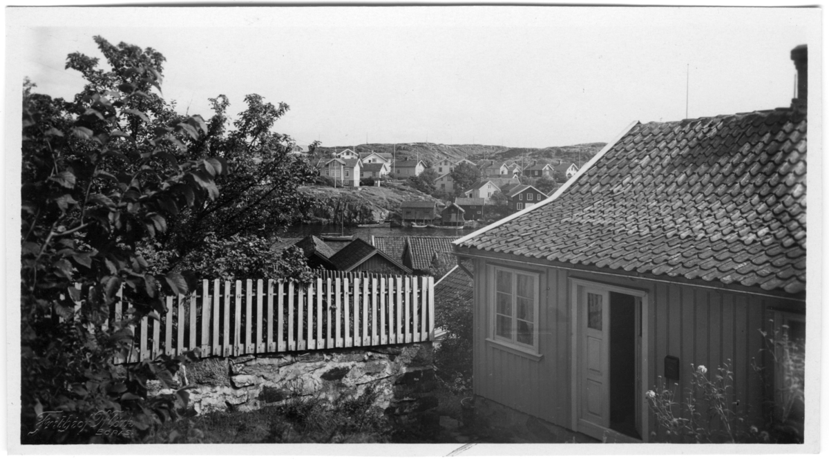 '''Idyll''.Vy ut över vik med hus och trädgård. :: :: Serie fotonr 1888-1963.'